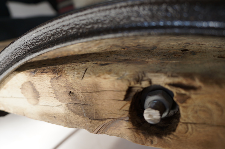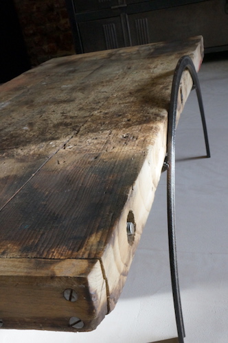 Table basse OSCAR. Ancien plateau d'établi en hêtre massif. Piètement réalisé avec les griffes du rateau fâneur de mon grand-père.