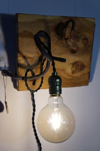 Applique COLORADO N°10. Applique en mélèze et cornières acier vieilli, douille portée par tige filtée vieillie, alimentation par gaine coton vintage.