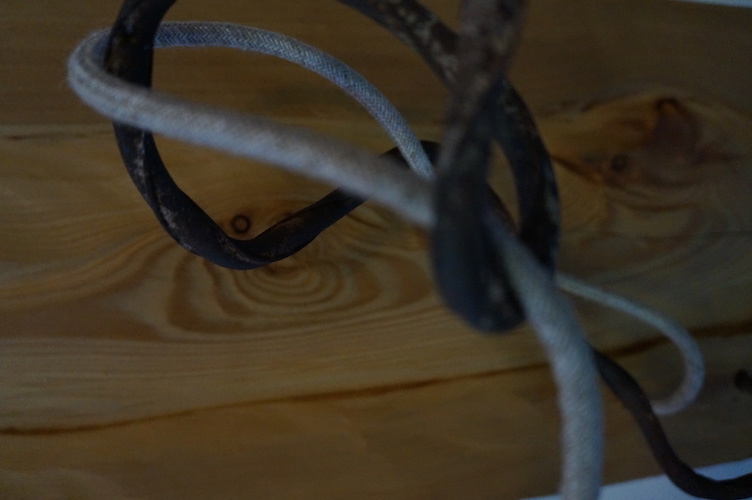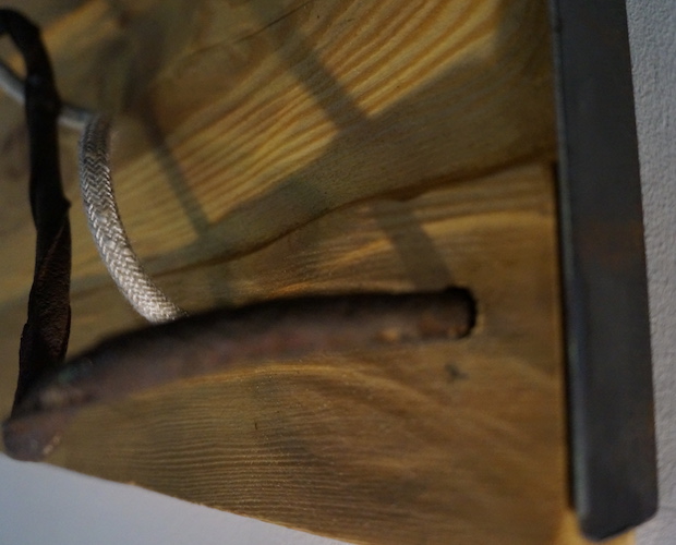 Applique COLORADO N°5. Applique en mélèze et cornières acier vieilli, douille portée par tige filtée vieillie, alimentation par gaine coton vintage.