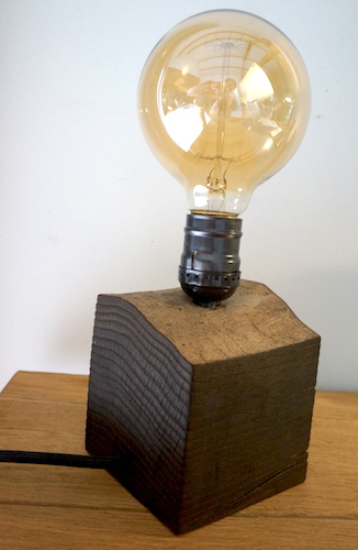 Lampe cube FRÊNE. Lampe à poser, cube en frêne massif traité « bois brûlé », alimentation par gaine coton vintage.