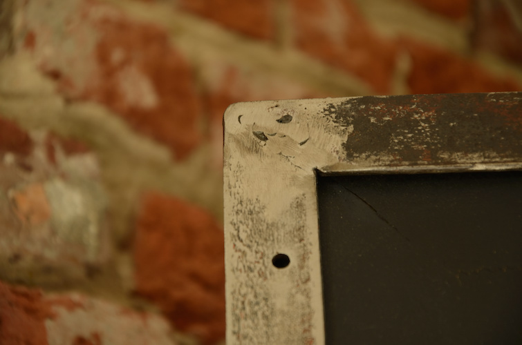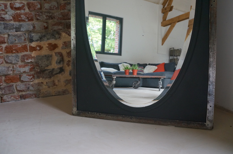 peinte en noire et cerclée d'une cornière métallique vieillie.