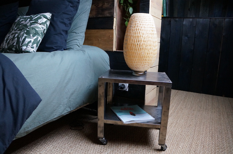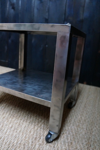 Desserte OPALE. Petite table d'appoint en métal sur roulettes, traitée à la cire « Canon de fusil ».