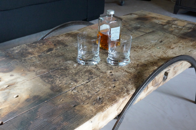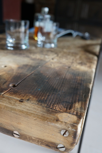 Table basse OSCAR. Ancien plateau d'établi en hêtre massif. Piètement réalisé avec les griffes du rateau fâneur de mon grand-père.