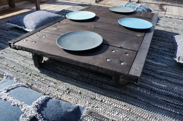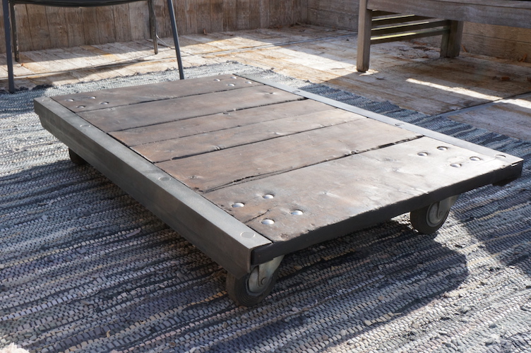 Table basse RUBEN. Palette de transport industriel sur roulettes acier. Plateau massif en bois brûlé, patiné et traité à l'huile de lin.